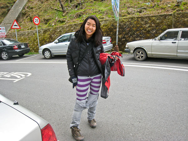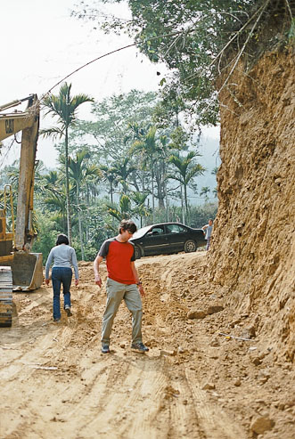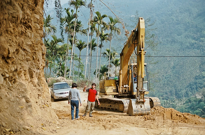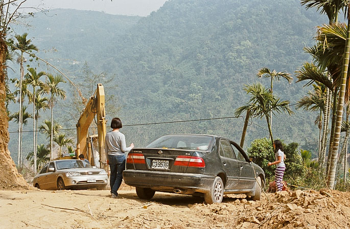 I was starting to get concerned that the road would continue to deteriorate, despite all the votes of confidence from drivers along the way. At one point, I bottomed out (fairly lightly, and on the side). I sure didn't anticipate bringing Irene and Betsy into this type of vehicular adventure, but at least the scenery was breathtaking, and no walking was needed. It felt like a in-depth safari through the stunning remote mountains of Taiwan. But the crux was still yet to come… While climbing up a dirt road, we encountered a 25' section of loose dirt and rock. Fortunately the road was plenty wide, though a heavy ground mover machine was sitting on half the road. Wendy and I stopped and investigated the slope, throwing large rocks aside. Then I approached the slope and slowly ascended, but the wheels spun, and I retreated back. Everyone got out of the car, and I noticed there was a guy in the Catipiller machine. Irene was able to confirm that the road was indeed passable the rest of the way, and that there was another way leading out of Rueili, so we wouldn't have to return this way. With just me in the car, I gave the slope another try, knowing I needed more speed to make it up. Apparently, the constuction guy asked Irene if I had ever driven a mountain road before, and wondered why I wasn't flooring it up the hill. I made it over half way up on the next attempt, but the tires started spinning, so I reversed back down. 2 more attempts got me a bit further, and packed the ground a bit, before I finally cleared the soft dirt. As we drove on, I noticed the parking brake was on (Wendy set it when we stopped). Wonder if that might have made things a bit tougher climbing up the rubble…