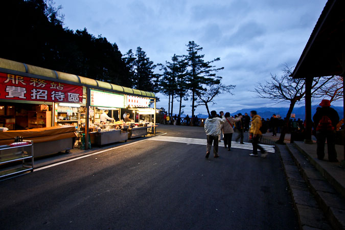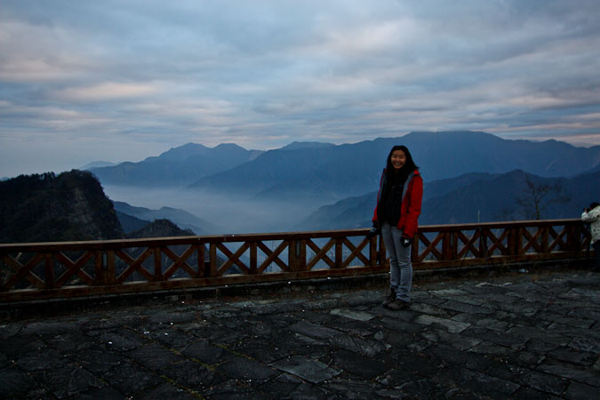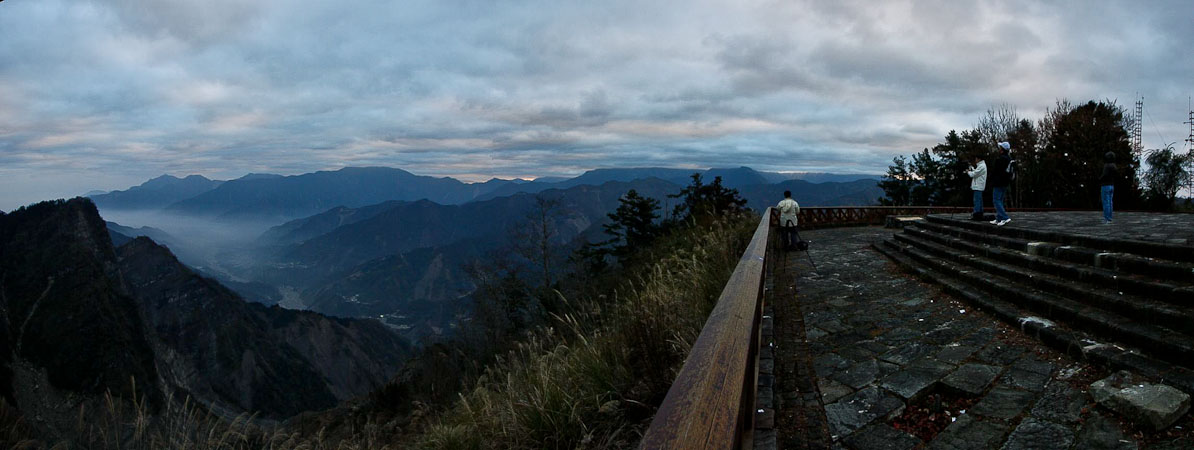 The sky was covered with clouds when we arrived at Chushan Station. The whole mass of people marched up the steps to the viewing platform. The crowd was getting excited about the faint pink showing in small patches amid the cloud covered mountains. We walked further up the road to another viewing platform, and had to jump a "no crossing" barrier to reach the top (a lady said it was ok). Great 360 degree vistas from the top, but still lots of clouds blocking Yushan Mountain, Taiwan's highest peak at 3940m. Just a few other serious photographers were at the platform with us. It was calm and peaceful away from the crowds.