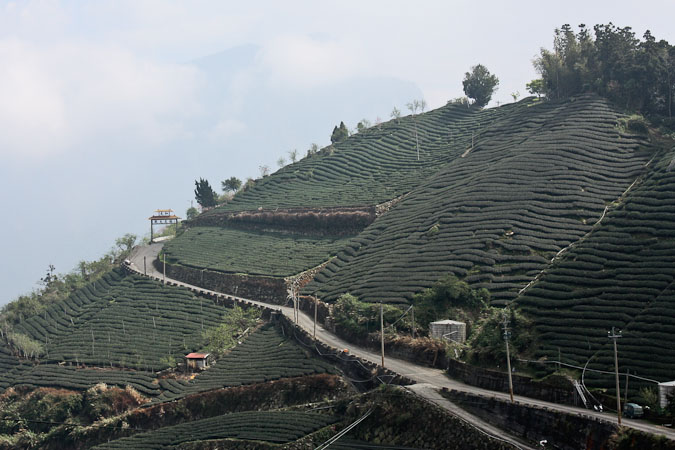 We continued up more windy roads, lined with tea plantations, past Fenqihu. The road led us up to the scenic tea plantation village of Taiho, where sweeping views of tea orchards lined the mountains. Soon after, we reached a fork in the road, with a sign saying the road to Rueili was under construction, and this was a detour. This was a surprise, but the guys in the visitor center yesterday said the road was open. We drove into the detour road, which was much narrower, and often gravel/dirt.