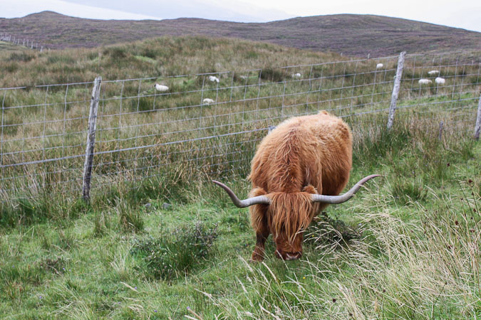 Using the wi-fi, we found a B&B to stay at in Portree tomorrow night. We had planned to visit Eilean Donan Castle in the afternoon, but the weather forecast was looking bad tomorrow, and so we decided to make a scenic drive to Elgol this evening in hopes of seeing the signature view of the Black Culliens from the shore, and do the castle tomorrow. The mountainous drive was indeed scenic, and there were plenty of sheep and long haired cows grazing near the roads. However, the clouds swamped the Cullien mountains, limiting the views.