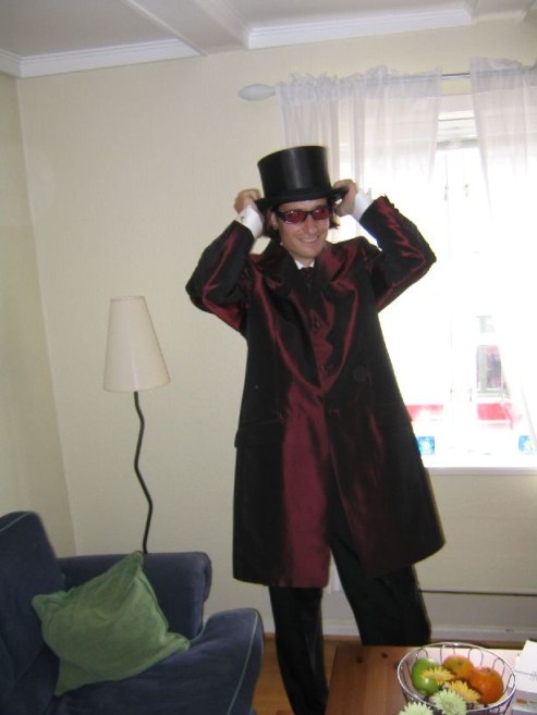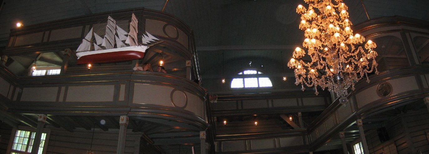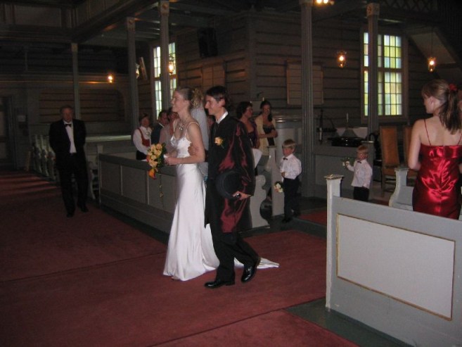 Returned back to the house, changed for the wedding, and walked to the church at 3:30pm. For his wedding, Karl wore a slick purple coat, and had a high quality foldable top hat, along with purple sunglasses. The wedding was at a church at 4:00, immediately following a 3:00 wedding there. Everything was said in English and Norwegian. There was pipe organ music, and a model boat hanging from the ceiling (another sign of a sea-town). Karl sits next to his mom, opposite Mariann sitting next to her dad. After they are married Karl and Mariann sit side by side, and Karl's mom and Mariann's dad sit side by side (does this mean the parents are married too???).