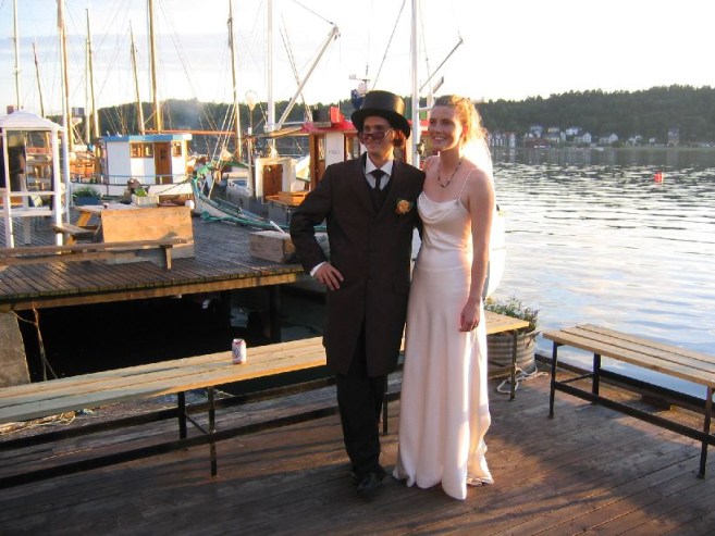 Afterwards, we get a ride to the reception area, on the harbour, arriving ~5:15. There is a toast as Mariann and Karl arrive dramatically via boat. They take some pics, then it's dinner time. Seafood buffet! All sorts of Norwegian seafood dishes: pattes, salads, mussels, prawns, crabs, salmon, scallop, quiche, breads, and sauces, with white wine. Through out dinner there are pauses for speakers. There are ~50 people at the wedding, which gives an intimate feel.