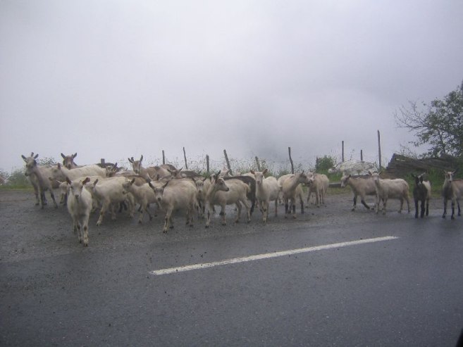 Drove 25km south to Geirangerfjord, considered the most scenic fjord in Norway, and saw nothing but fog down and up the "spectacular valley" full of "breathtaking views" along the hairpin roads. Bummer. I had a hike planned here, but no sense getting out in the fog and rain to see nothing. Too bad we didn't drive here last night before the rain moved in… Did get to see some goats on the road.