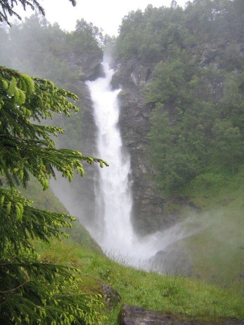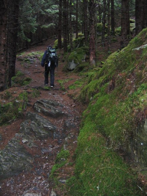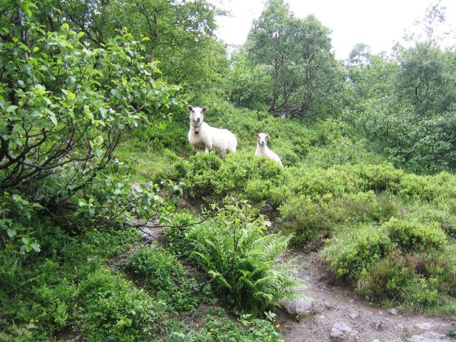 The trail ascended through a forest, and quickly we were above the treeline at probably under 1000ft. There was a powerful waterfall just off the trail that gave off a heavy mist. As we climbed the hills, we saw many sheep.