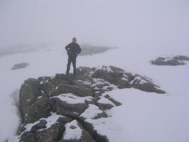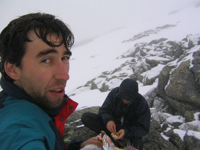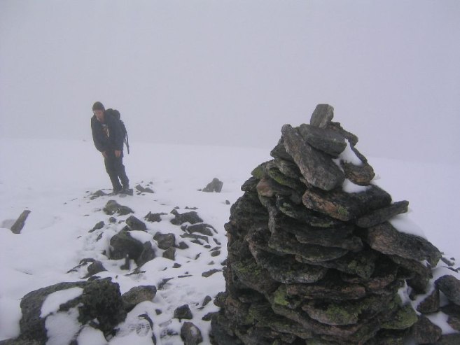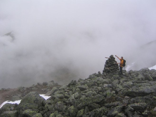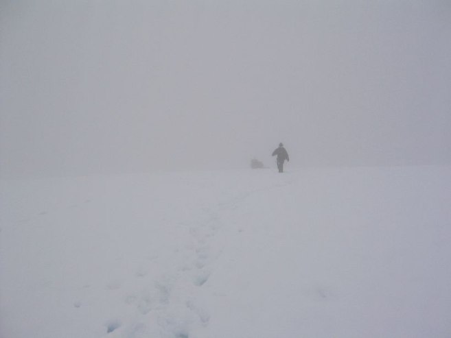 We were the first on the trail today, and needed to break a path in the snow. Feet got very wet today. Soon the cloudy skies turn even more foggy, and the rocks become fewer. At one point, leading the way up the white hill that merged with the white sky was a bit disorienting. It started sleeting a bit. Well, no hopes for a view from the top today.