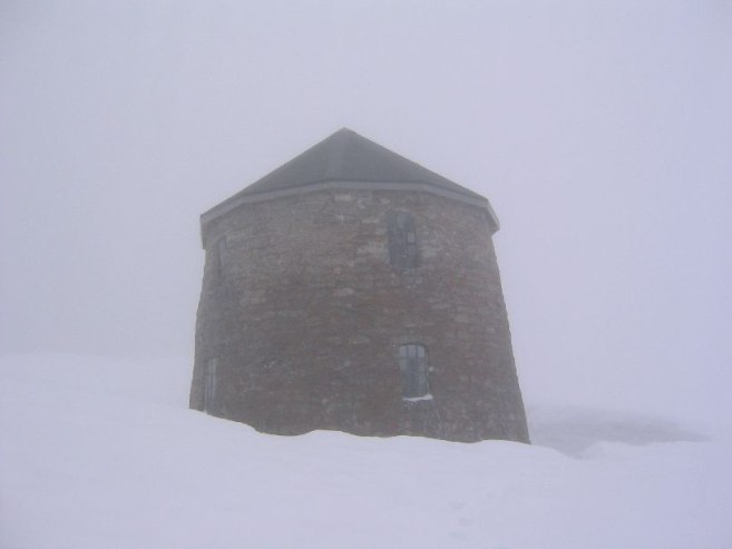Around 1400m up, we see a man and women coming up behind, and let them pass. Then we conveniently follow their footprints up in the snow. Finally we make it to the top in 5 hours. My watch's altimeter is within 1 meter of the 1848m summit.