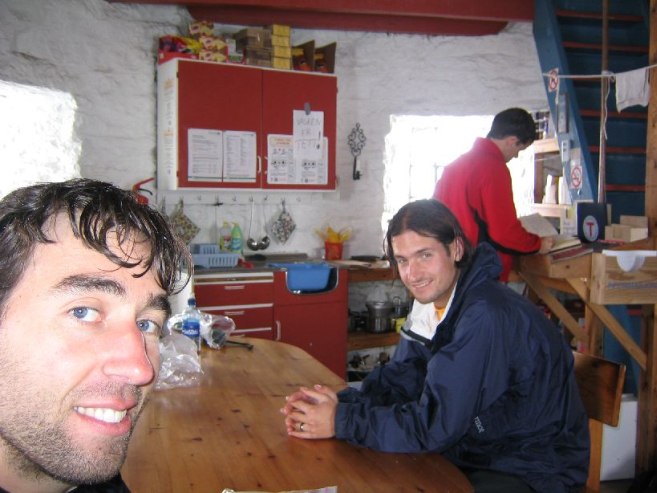 There is a hut stocked with food and beds (for a price), with walls over 1m think. Not sure how they resupply this place, but it's certainly a nice stopping point. Oddly enough it's colder inside the hut than outside (4 degrees C vs 5-6 degrees outside). We eat inside and wring our socks. We try to dry our feet, but just end up putting on wet socks and shoes for our descent.