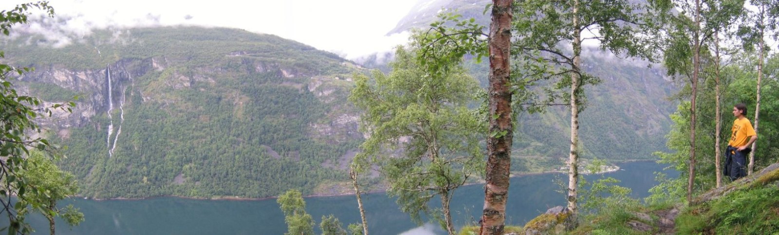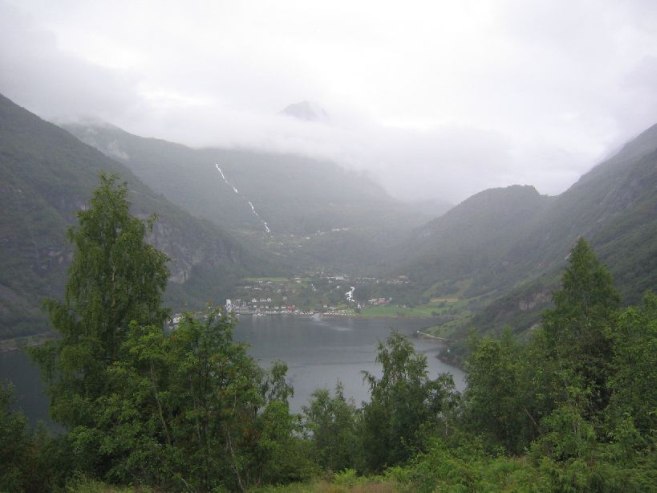 There was some blue sky behind us as we came to Geiranger, but rain and clouds were found in the fjord. We waited at a lookout point, and ate, ~7:00pm. Eventually it clears a good amount, and we try for a hike along the side of the Geirangerfjord.