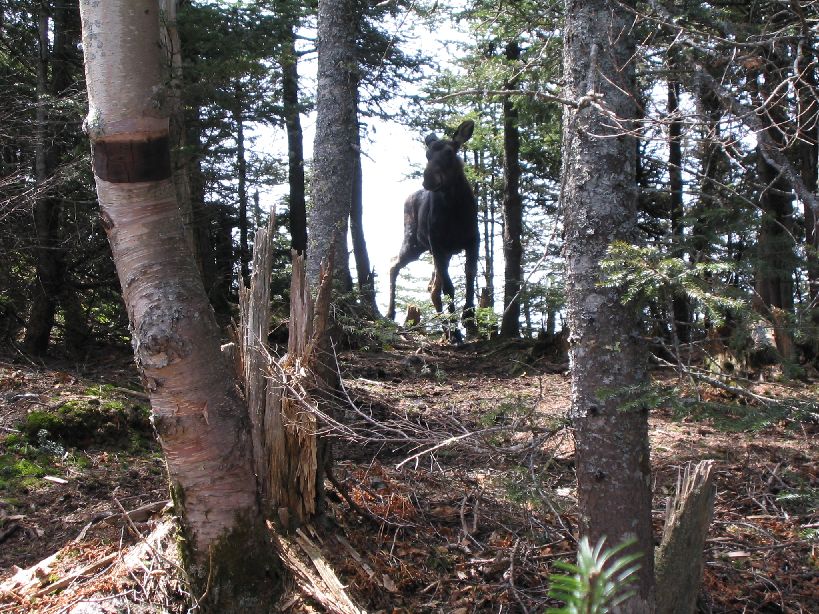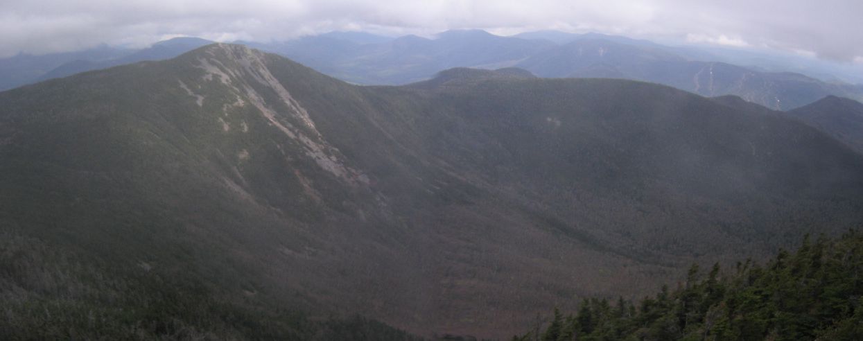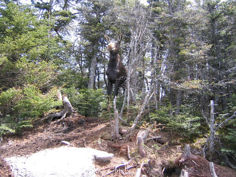 When I got to the peak of Middle Tripyramid, I thought I saw a dog running around, but no. A moose made it's way up to the peak, and couldn't figure out how to get down. I frooze, and the moose kept circling on the limited 15 yard peak area along the trail. Got some scary looking pictures. Finally it moved far enough aside for me to quickly get by, and I went to the lookout rock. Took pics, and turned around and the moose was staring at me. Cliff one way, moose the other. It went back to circling, and I ran. For the next 10 minutes the smallest sound would make me turn, expecting to see the moose on my back. Thought it might be stuck up there forever, but a guy 15 minutes behind me said he saw moose tracks, but no moose when he passed the peak.